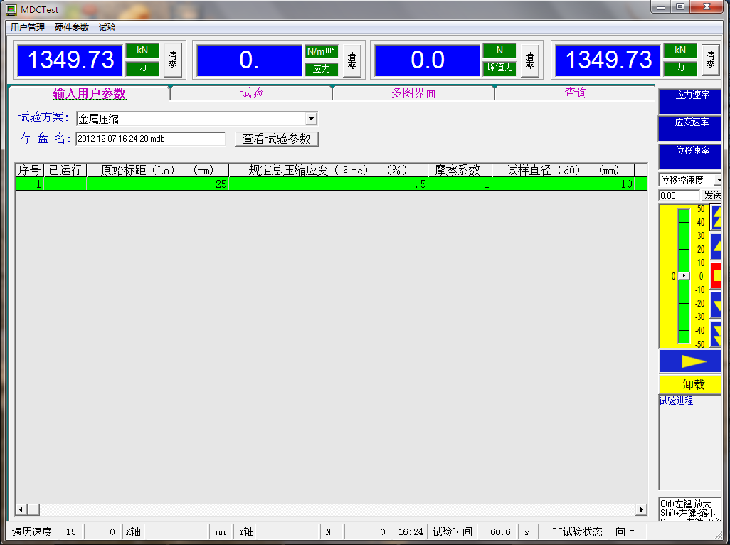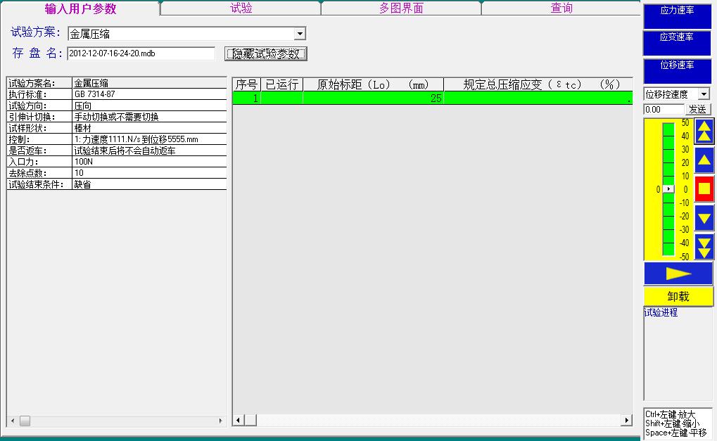 試驗方案:通過編輯運行方案,可實現(xiàn)力控、位移控、變形控等多種控制方式組合運行,從而滿足任何靜態(tài)試驗運行需要??稍O置試驗參數(shù),如運行參數(shù)設置、 試樣參數(shù)設置、運行條件設置、試驗結(jié)果項目管理??蛇M行試驗運行管理,如啟動試驗運行、試驗運行過程管理、試驗狀態(tài)管理及示值顯示管理。